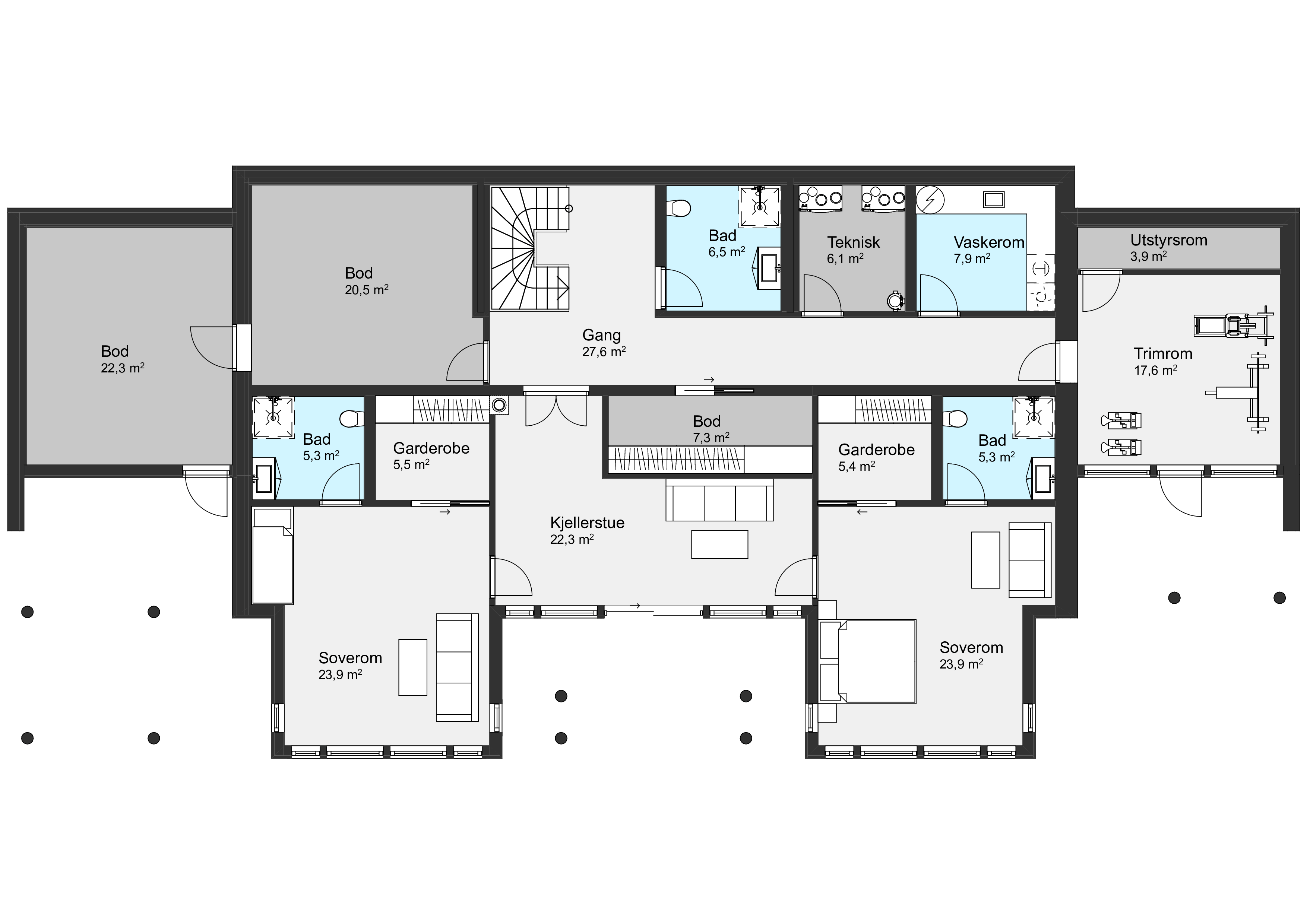 Lindås er en bolig for storfamilien – og litt til. Med over 565 m² fordelt på tre etasjer, er det rom for alt fra hobbyer og trening, til gjester og hverdagens små og store behov.