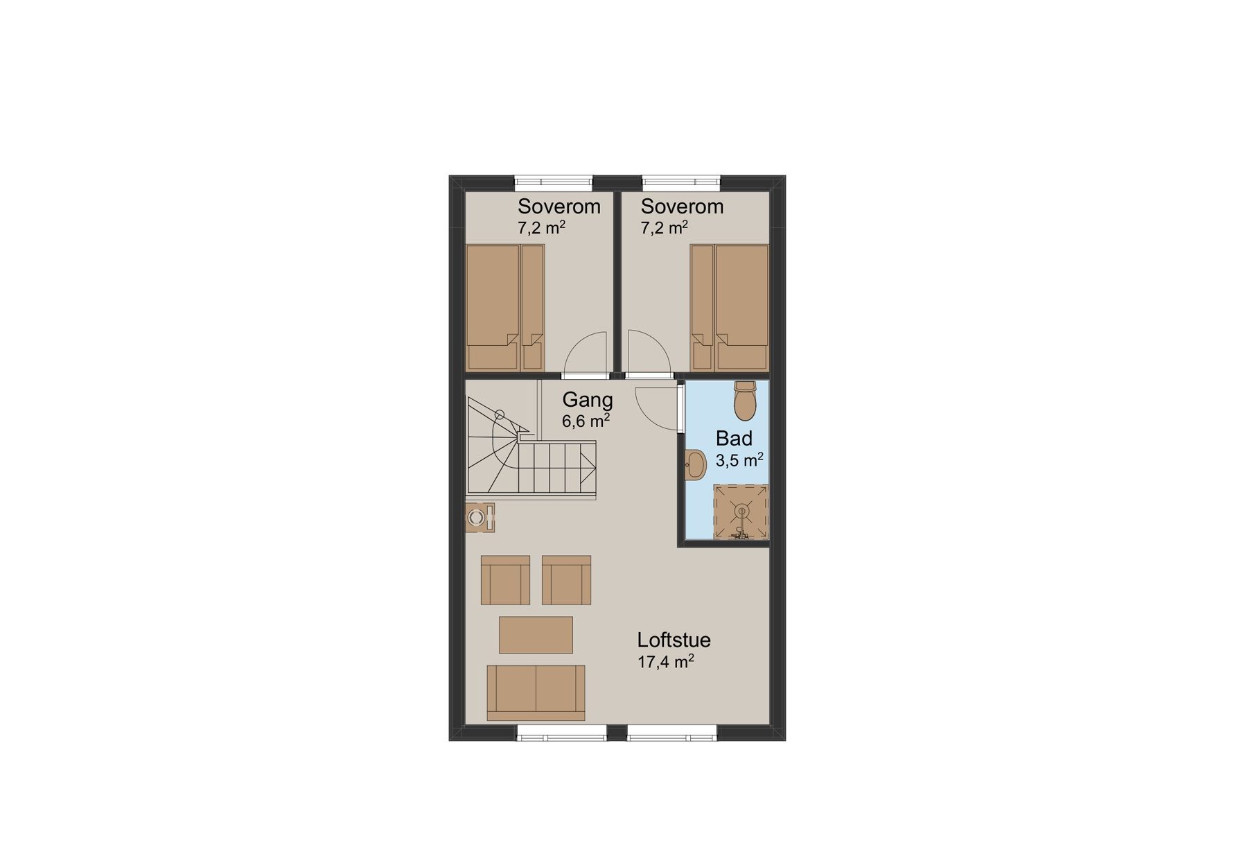 I andre etasje finner du to soverom, et bad og en herlig loftstue hvor det er høyt under taket. Her strekker vinduene seg fra gulvet til mønet, og du kan nyte utsikten sammen med familien din.